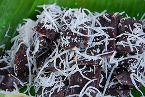 Kanom Linma It is a dessert made from black glutinous rice flour kneaded with water until it becomes viscous but not messy. Add salt to make it slightly salty. Some use white glutinous rice flour kneaded with sugarcane juice and salt to have a sweet and salty taste. Mix grated coconut with sugar. Help make delicious snacks and appetizing.
