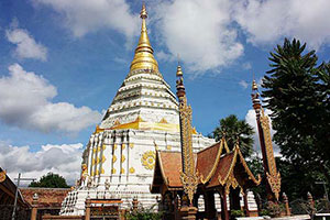 และทำพิธียกฉัตรเมื่อ พ.ศ. 2๐64 เดิมคงเป็นเจดีย์ทรงระฆัง แต่รูปแบบในปัจจุบันคงมีการบูรณะมากแล้ว โดยเฉพาะส่วนฐานที่ขยายใหญ่มากและเลียนแบบศิลปะพม่ารุ่นหลัง วิหาร เดิมคงมีวิหารมาแล้วตั้งแต่ราวพุทธศตวรรษที่ 21 เพราะเป็นที่ประดิษฐานของพระพุทธสัพพัญญูเจ้า วิหารองค์ปัจจุบันอาจจะเป็นโครงสร้างเก่าคราวสร้างโดยพระมหาเทพเมื่อ พ.ศ. 2362
